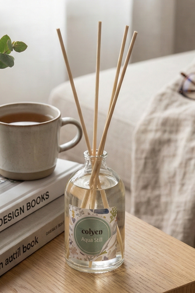 Colyen Aqua Still Çubuklu Oda Kokusu 100ml Ferahlatıcı Cam Şişe ve Pastel Bitki Desenleriyle